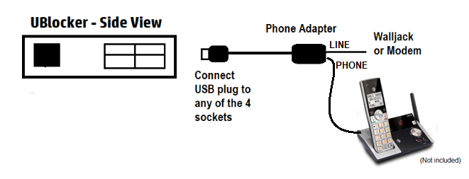 Important: This know that it is not required to have a phone connected to the Phone Adapter of the UBlocker in order for the UBlocker to work properly, however you will need a phone connected to the phone adapter in order to make sure you have dial tone going to the Phone Adapter. After you finish the UBlocker setup, you can unplug the phone and use it on any other wall jack, if desired.